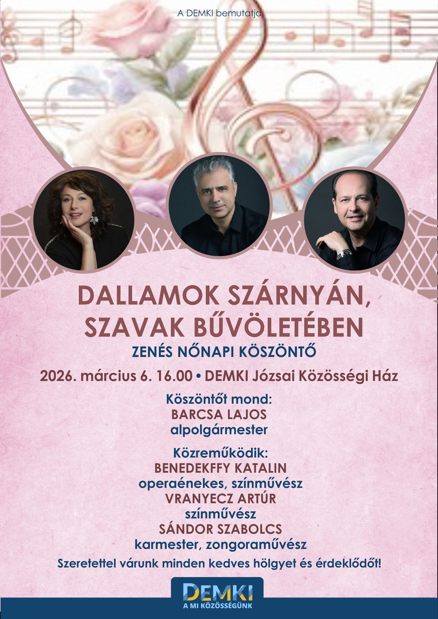 Nőnap alkalmából 2023.03.06-án 16 órás kezdettel Debrecenben, a DEMKI Józsai Közösségi Házban minden kedves hölgytársamat és természetesen az urakat is nagyon sok szeretettel várom a művész társaimmal közösen tartandó köszöntőnkre.